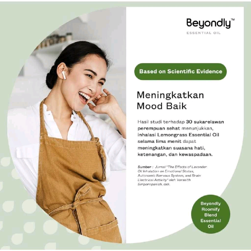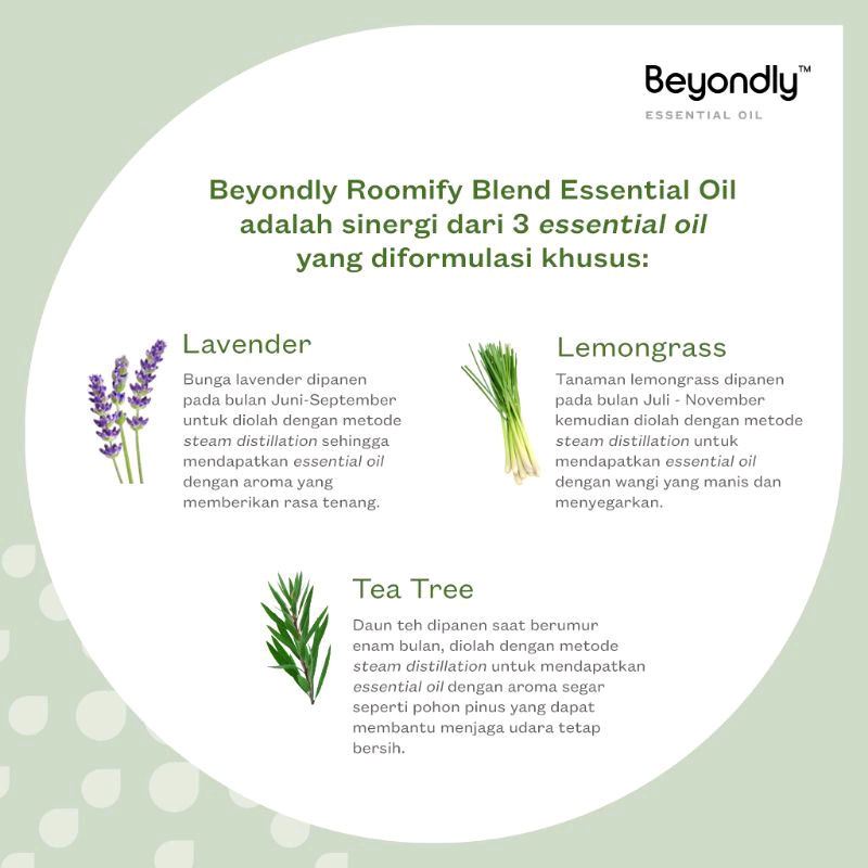 34% OFF100% Pure Essential Oil.Aroma Roomify yang segar membantu menciptakan suasana seperti di pegunungan, membuat udara terasa lebih bersih, pikiran lebih tenang, dan suasana hati menjadi lebih positif. Diformulasikan dengan sinergi Lemongrass, Lavender, dan Tea Tree Essential Oil bersama ahli essential oil global untuk memastikan kualitas dan kemurnian terbaik.Menggunakan teknologi synergy blend, hanya kekuatan dari masing-masing essential oil yang digabungkan secara efektif untuk menghasilkan manfaat yang lebih besar. Ukuran: 10 mlNo BPOM: NA18220602367HalalAroma : Green. Fresh. PurifyingKandungan :- Cymbopogon Citratus Leaf Oil (Lemongrass Essential Oil)- Lavandula Angustifolia Oi (Lavender Essential Oil)- Melaleuca Alternifolia Leaf Oil (Tea Tree Essential Oil)