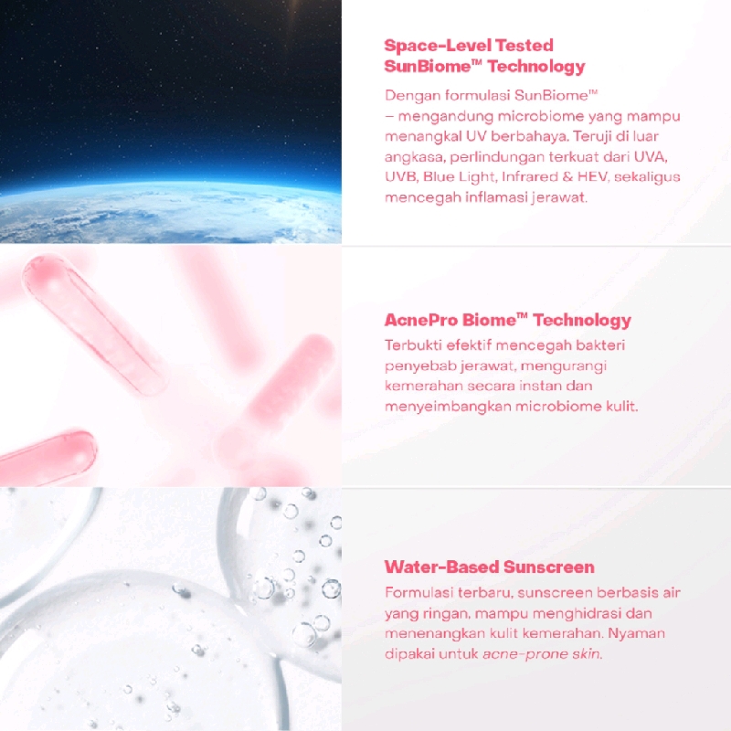 Sunscreen ini memiliki formula yang berbasis air, memberikan tekstur seringan air, sensasi segar, dan tanpa whitecast untuk menghindari rasa tidak nyaman. Selain itu, sunscreen ini juga dilengkapi dengan AcnePro Biome yang mampu secara instan menenangkan kemerahan akibat jerawat*, secara efektif mencegah munculnya inflamasi jerawat, serta mampu mengurangi sebum berlebi