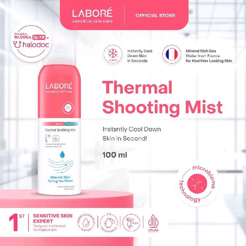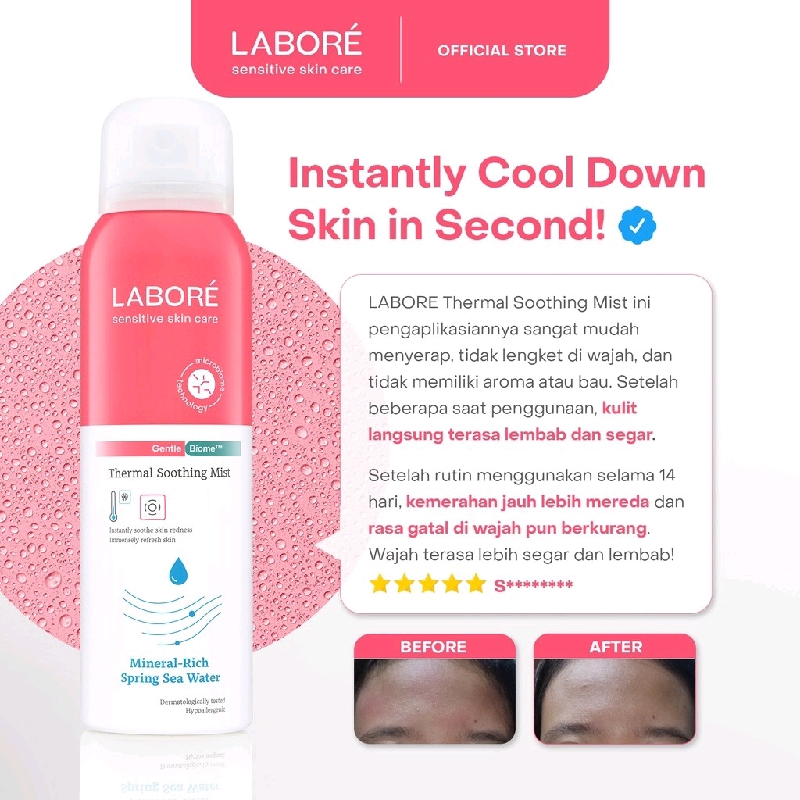 LABORÉ Sensitive Skin Care GentleBiome™ Thermal Soothing Mist 100 mL INSTANTLY COOLS DOWN burning skin in seconds, anytime and anywhere! dengan Mineral-Rich Sea Water dari lautan Prancis, yang diperoleh melalui proses purifikasi untuk mendapatkan air dengan kandungan mineral yang seimbang, menyejukan sensasi “panas” atau “terbakar” pada kulit secara instan dalam hitungan detik, dimanapun dan kapanpun! Kemasan 100 ml yang travel friendly cocok dibawa bepergian, baik dalam maupun luar negeri.