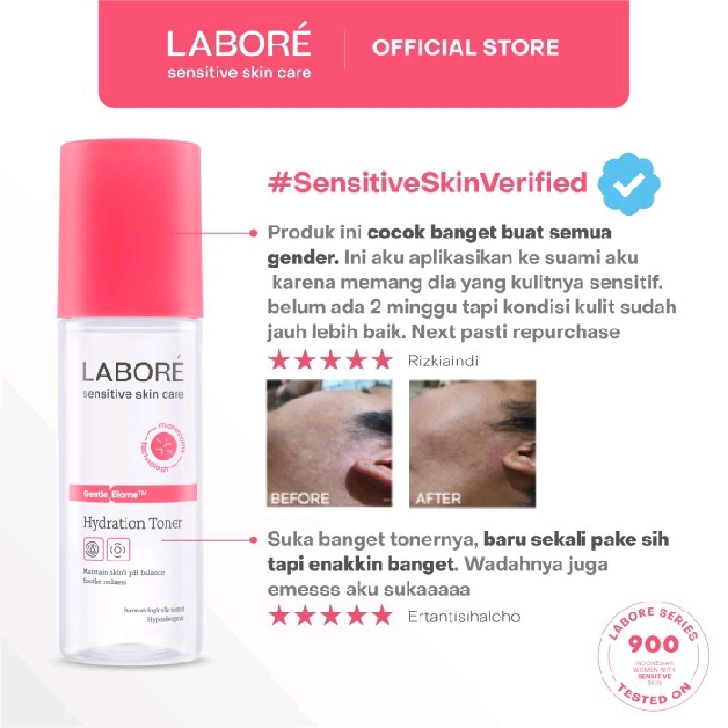 35% OFFLABORÉ Sensitive Skin Care GentleBiomeTM Hydration Toner merupakan toner bertekstur rich-liquid dengan formula pH sekitar 5.5 dan non-alkohol yang cepat meresap dan ringan di kulit dan dirancang khusus untuk mengurangi dryness (kekeringan) pada kulit sensitif di negara tropis hingga -12.98%*.